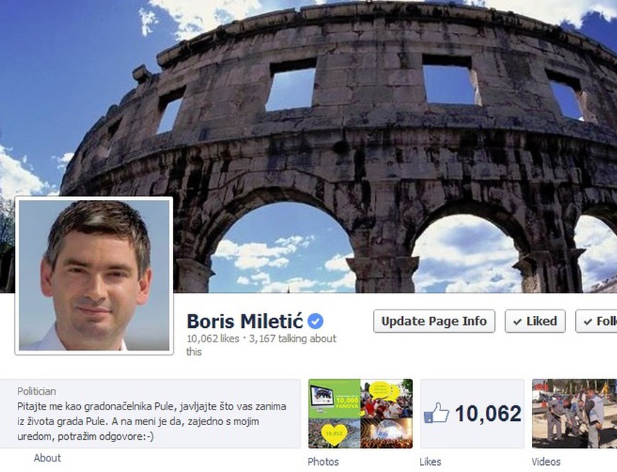 Facebook stranica pulskog gradonačelnika Borisa Miletića ovog je tjedna dosegnula i brojku od preko 10,000 fanova, gotovo petinu ukupnog broja stanovnika Pule.